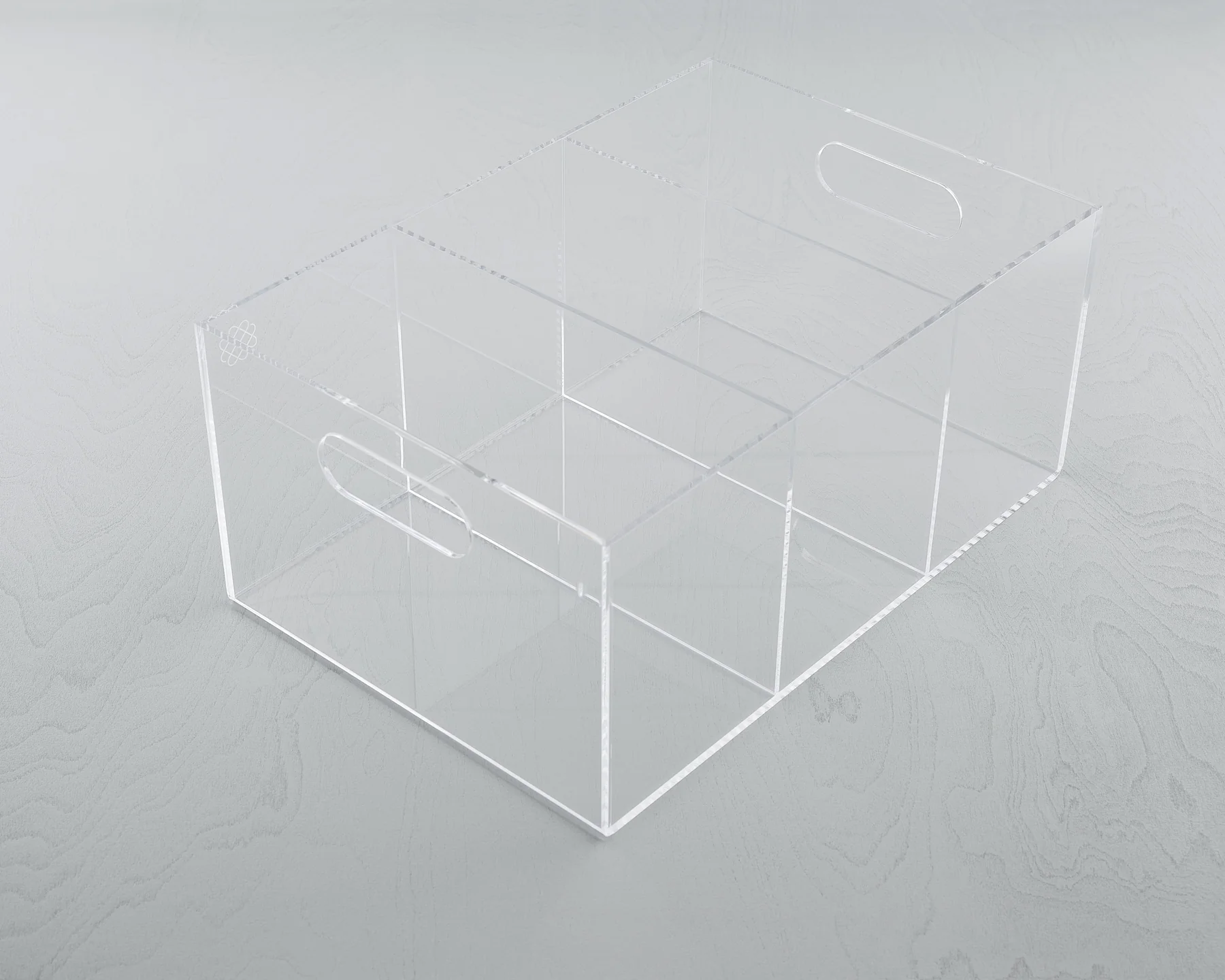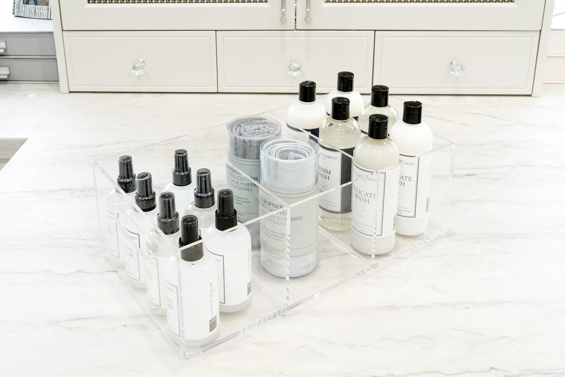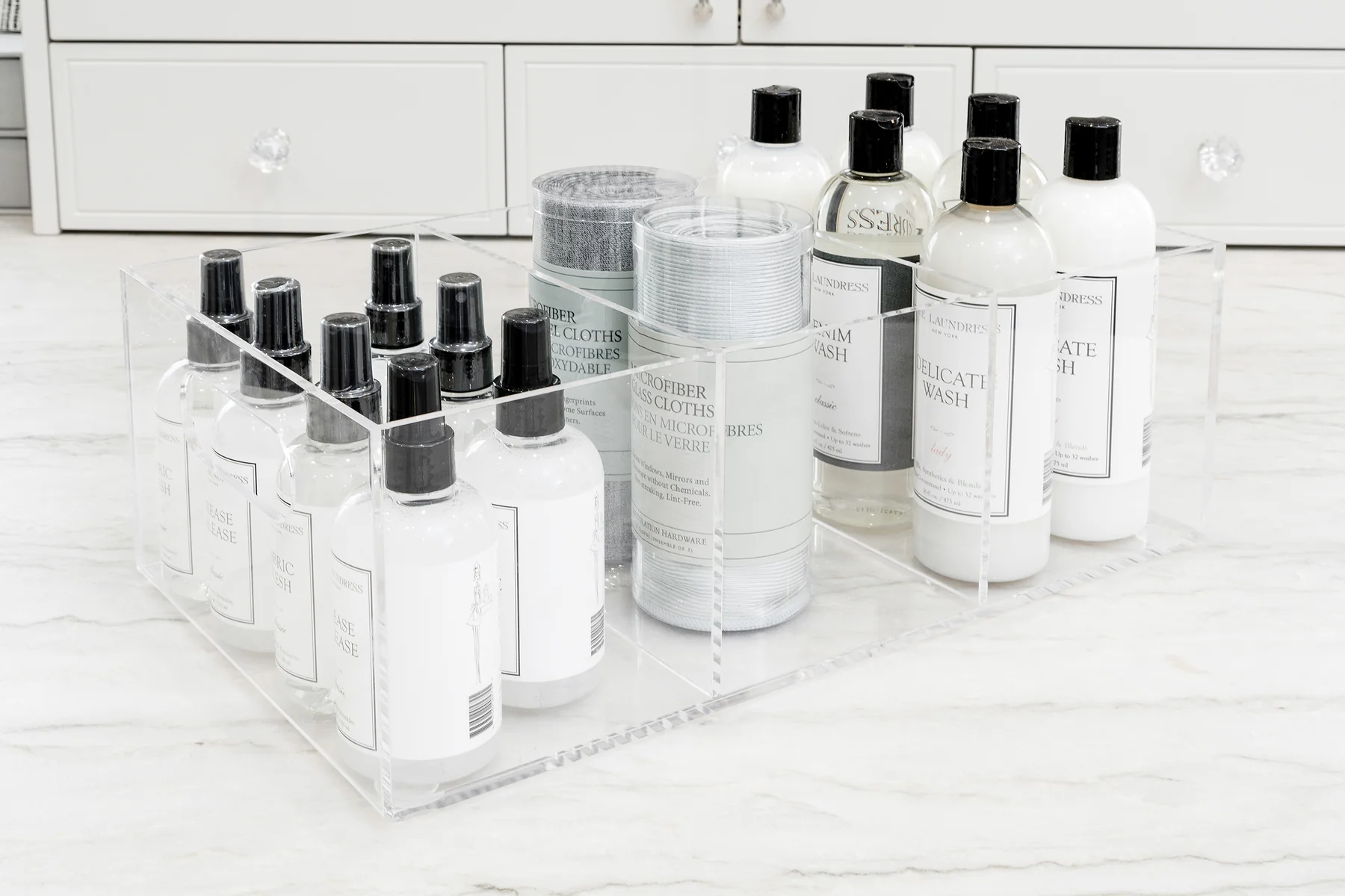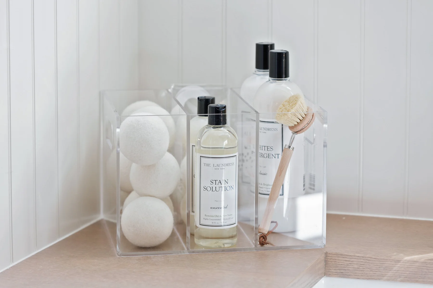 Introducing the Remi Custom Organizer Caddy by Abstract Acrylic, a versatile three-compartment design perfect for organizing your essentials. Ideal for the kitchen, it neatly holds detergents, disinfectant wipes, and more. In the laundry room, use it to store dryer balls, baby wipes, dusters, and cleaning cloths.